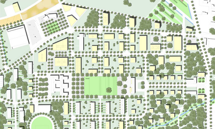 Der Städtebau wird aus den vorhandenen Bebauungs- und Vegetationsstrukturen unter dem Aspekt sozialer und ökologischer Nachhaltigkeit entwickelt.