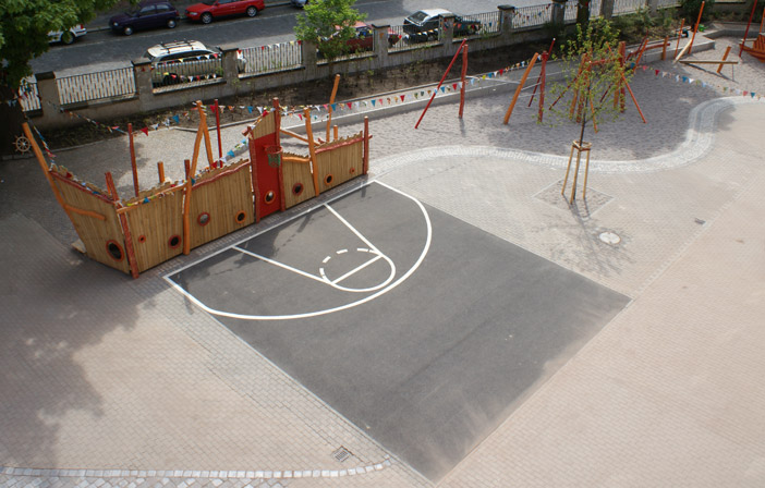Blick auf das "Schiffsheck" mit Asphalt-Spielfläche